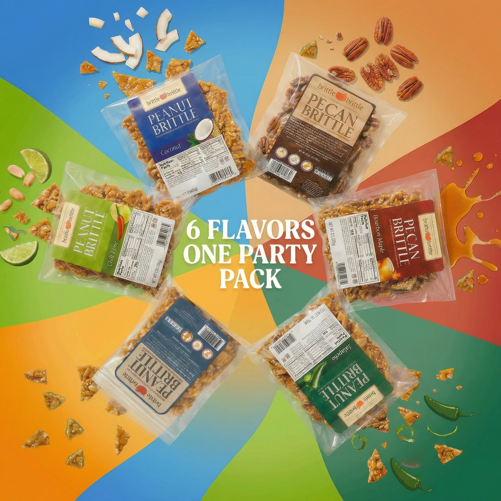 The Brittle Party Pack™ brings together six handcrafted flavors — from buttery classics to sweet heat — in one crowd-pleasing collection.
